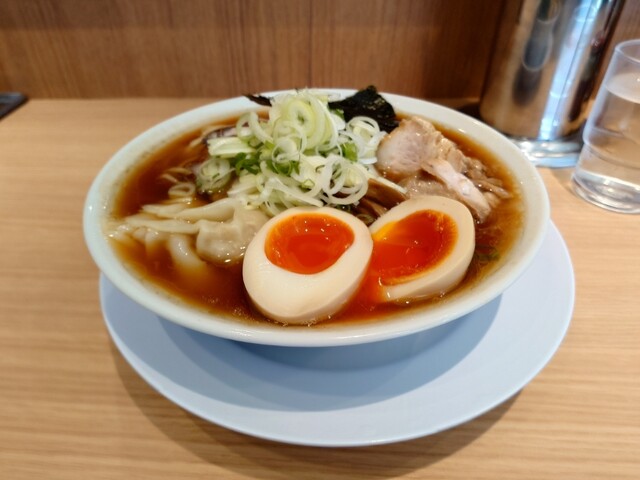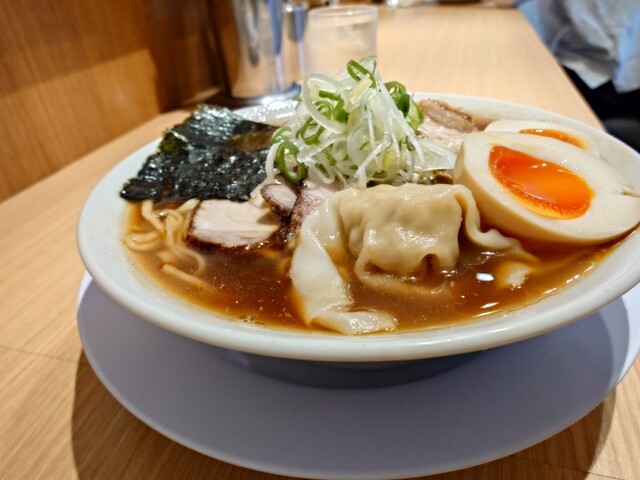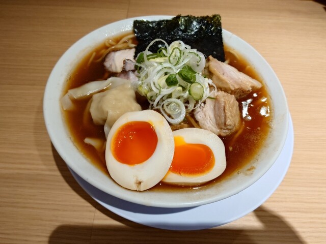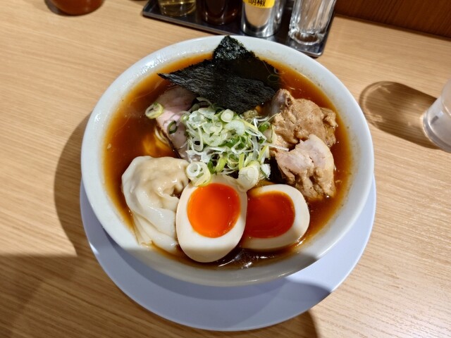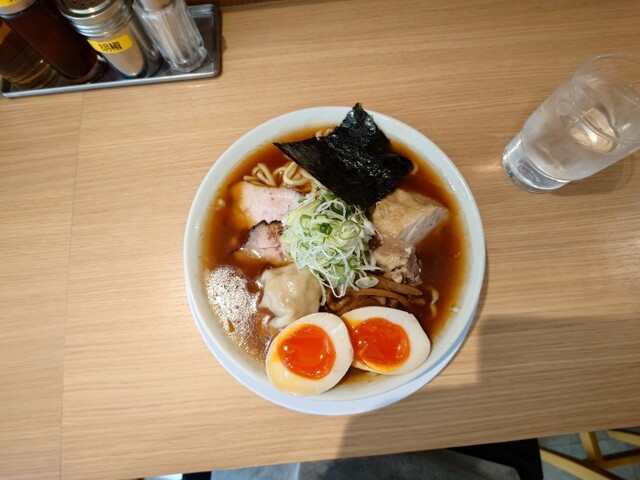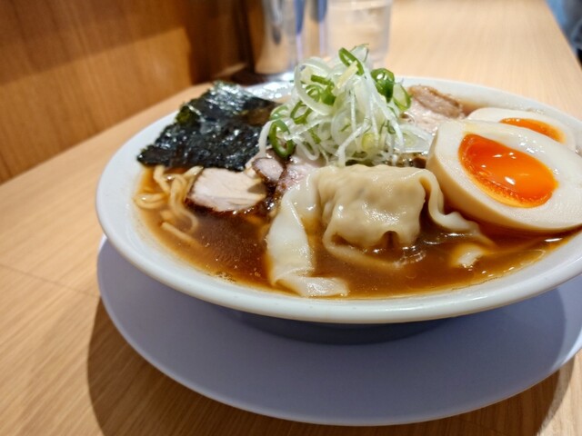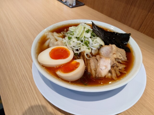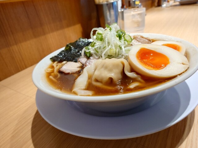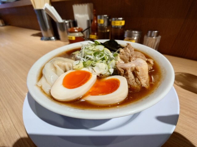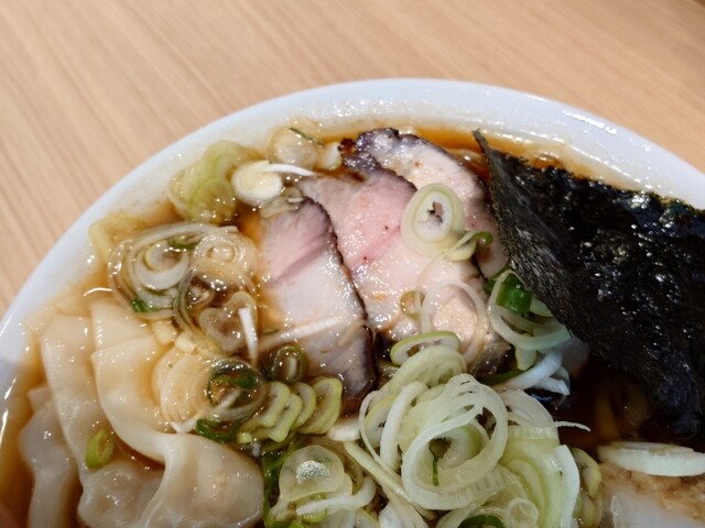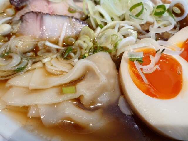 ラーメンの上には、バラ角煮とももチャーシューと具がたっぷり詰まったワンタン。