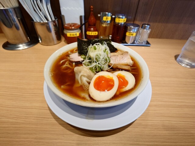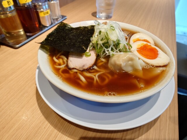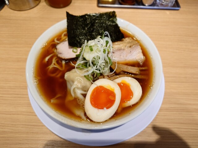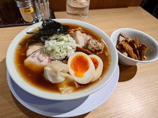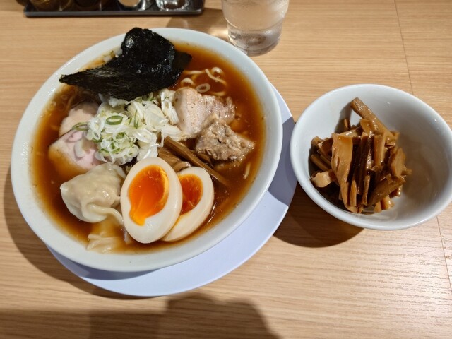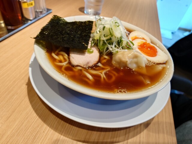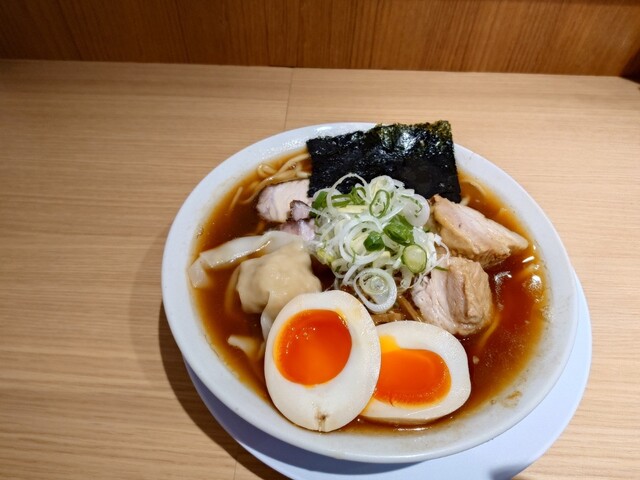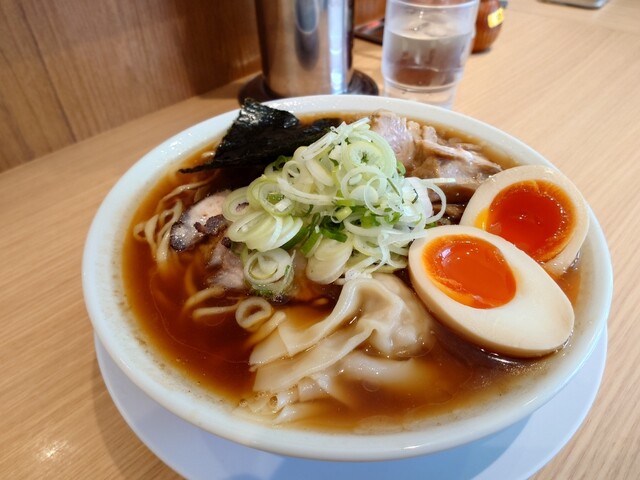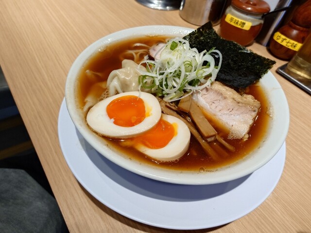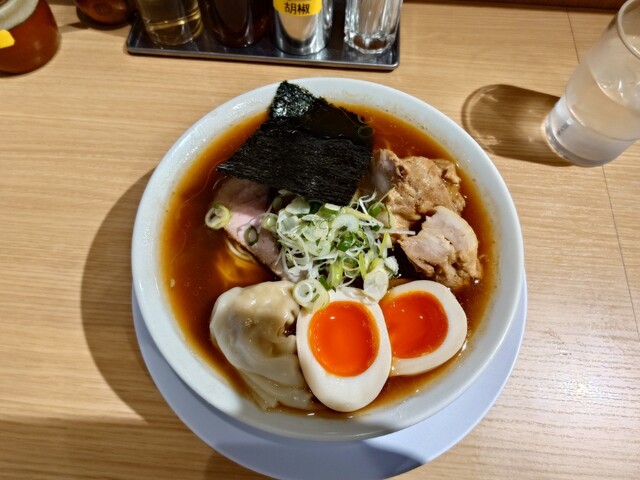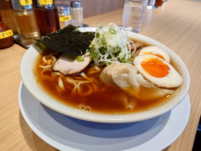 ラーメンの上には、バラ角煮とももチャーシューと具がたっぷり詰まったワンタン。