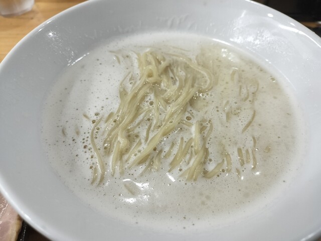 狙って注文した白湯ラーメンもおいしいです。泡立てるため?スープが熱々じゃないのはちょっとマイナス点かも?細麺なので大盛はなく替玉で対応。細麺でも気にせず大盛を出す店多いですけど…。