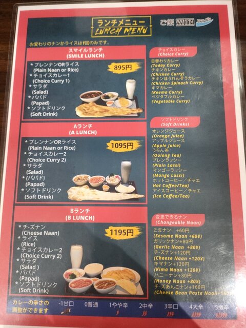 ここのお店は、サラダ、カレー、ドリンク、ナンのセットが基本のスマイルセットで895円。Aセットはカレーを2種類選べて+200円。Bセットはナンがチーズナンになって、更に+100円。