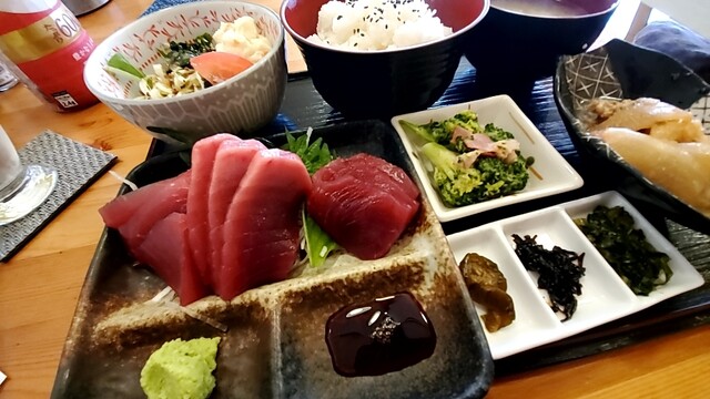 お店。ママさんは、自分に有無を言わせず「定食は三崎のマグロです」