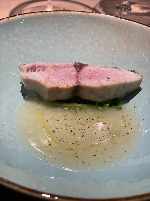 春の代表・鰆です。さらに小松菜の菜の花で春が凝縮。桜の季節、春雷と共に一年で初めて虹が出るという。そんな季節に合わせて、鰆の表面に虹が出る様に仕上げました、とシェフのご説明を聞いて「???」と思いましたが、見ると本当にキラキラしてるのです!!驚き!
