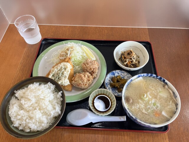 豚汁定食 唐揚げとアジフライ付きをいただきました 唐揚げもタルタルのアジフライも安定の美味しさでした そこに豚汁とはこれはもう旅の締めとしていうことない食事となりました ごちそうさまでした 開店直後の入店時には3組目でしたが その後続々入店 家族連れも多く地元に愛された人気店なんですねー 近くにあったら何度も通いたいお店です
