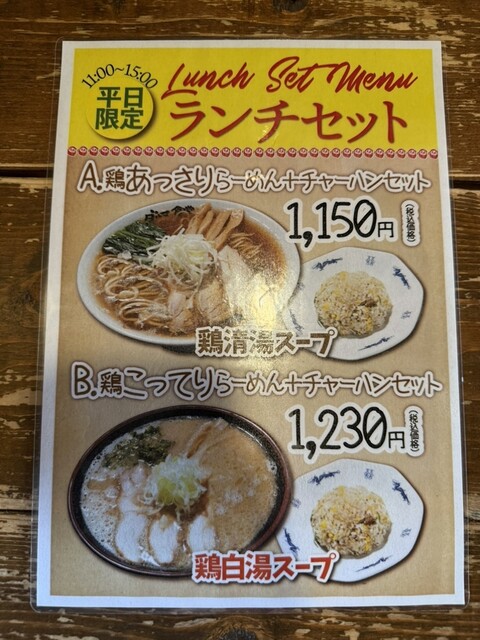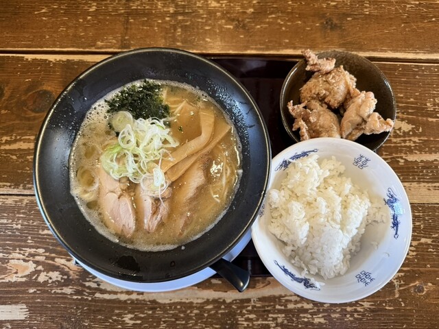 開店直後に入店。向かい合わせのカウンターに座ってメニューを全部確認。鶏こってり、鶏あっさりの記載が多かったのですが、鶏の記載が無い唐揚げと半ライスのこってり定食にしました。結論から言うと全部鶏出汁のようです。チャーシューも全て鶏チャーシュー。あっさりは透き通った鶏がらスープ、こってりは煮崩したとろみのついた鶏出汁です。