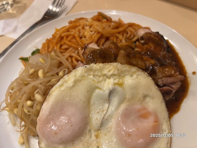 女将さんは可愛い声で受け答えとフロアでのサービス。シェフはおとなしめでとてもまじめ。いつもカウンター席に座らせてもらい話す。カキフライもチキンソテーもオムライスも美味しい。次回はポークソテーにしようかな?いつも、食べながらメニューを研究。また、何度も行きますよ。スパゲティはアルデンテではないけど、そもそも、セモリナ粉ではなさそう。もやしの何かも付け合わせになってるやはり、目玉焼きトッピングは欠かせない。スパゲティの味付けはしっかりしているがやはり茹ですぎ?肝腎のチキンソテーは完ぺきの母。この日は他の客もいなかったのでテレビの音を聞きながら。おとなしく黙々と食べられた。