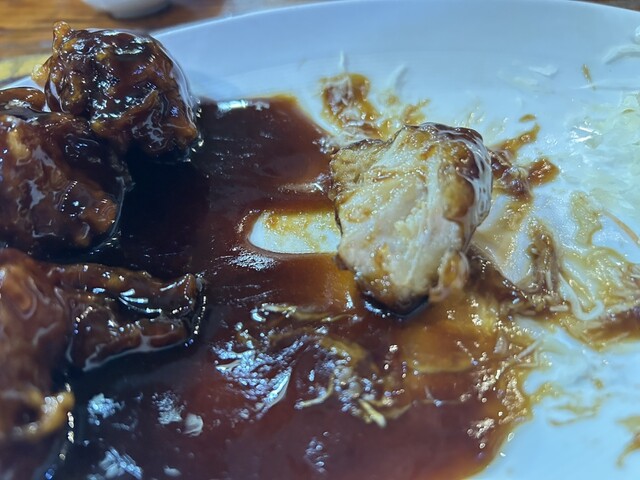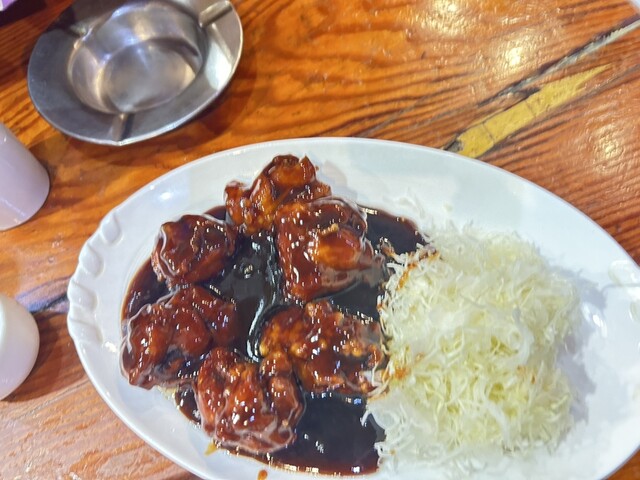 ずっと気になっていた駅側にある立て看板の1品。「鶏の黒酢炒め」。どの地方の料理屋なのか不明、上海でも広東でも北京でもない。店員は吉林省出身者。日本語うまい。鶏は柔らかくジューシー。それに黒酢あんがかかってる、本来あるべき味の位置よりも甘い。、甘すぎる。みたらし団子じゃないんだからっ!添えてあるキャベツの千切りはカピカピのカピバラ。紹興酒を頼んだが、よく、町中華でありがちな保存状態不良品ではなく、まともな管理と思われる味。飲む分にはまた来たいが、ほかのきゃくの雰囲気がヤバイ。なんだか超短期肉体労働者系の雰囲気の男客。そして、店内に喫煙者いなかったのに、退店後の手のひらがタバコ臭かった。不快だ。店内の雰囲気はそんな、、どんよりした嫌な空気感。料理はまぁまぁの味。都心にこの手の料理をこの価格で出すところがないから、また、帰りに寄ります。キャベツにはマヨネーズかけて欲しいな。