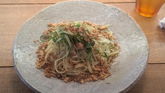 ツナやフライドオニオン、ニンニク、九条ネギたっぷりのペペロンチーノ