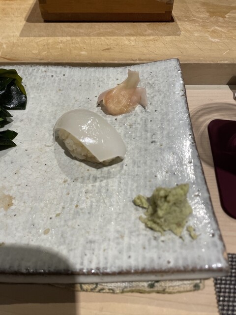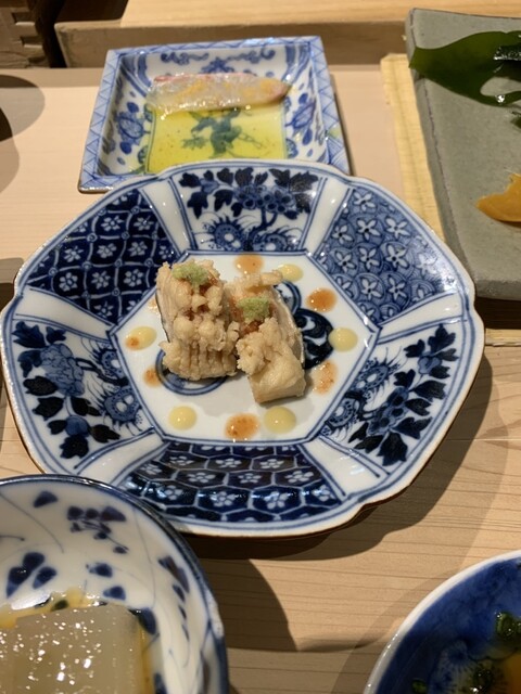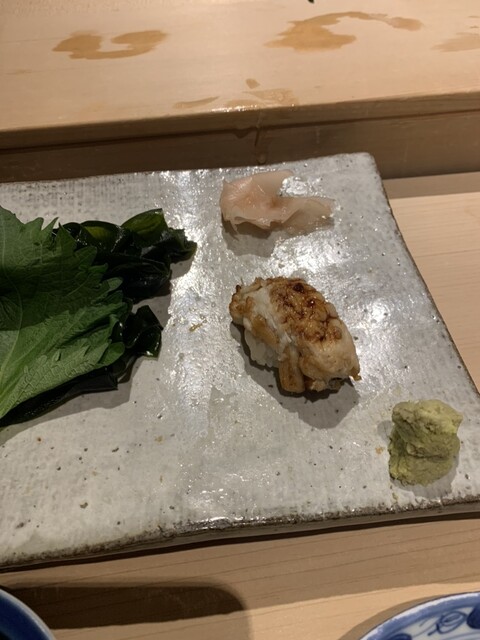 中トロも素晴らしい。ねっとりと脂もジュワッと。イカも新イカ(大好物)の様なぷりっぷつんで香りも良い。そして、ふぐの煮こごり。コチラの名物の一つに初めの方に供される煮凍りがあるのですが、そちらも驚くほどクリアでスッキリ旨い。このふぐの煮凍りも旨かった。