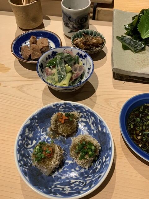 白身の朧昆布、ぬた、マグロの煮付け、皮焼きの酢、白身のつくね、白身のオリーブオイル等