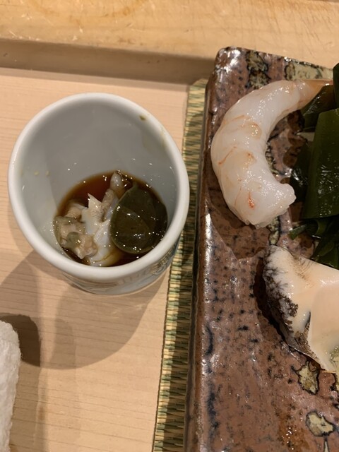 頃合いを見てお刺身を。白身、貝、海老と続きます。今回は鮑の柔らか煮も。