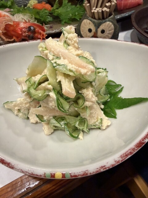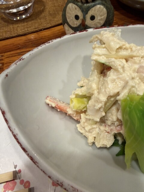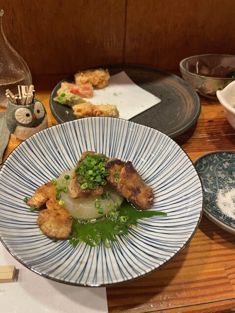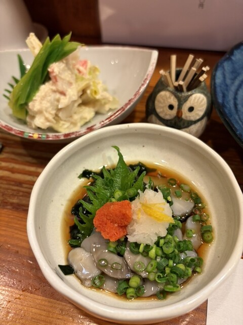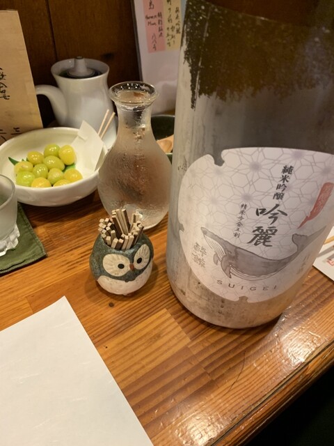 ご挨拶を済ませて、今日は2人なのにテーブル席に。久々の小上がり。靴下大丈夫だっけ?とか気にしつつ。普段カウンター好きでカウンターが多いのですが、広々座れるのも良いですね。地下に個室もあるみたいです。すっかりフクロウ君の見切れ写真を忘れてしまう。いつもカウンターだと視界に居るので忘れない。