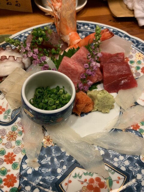 刺し盛(一人前)てっさ、黒むつ、タコ、イカ、カツオ、イワシ、海老、赤身、トロ