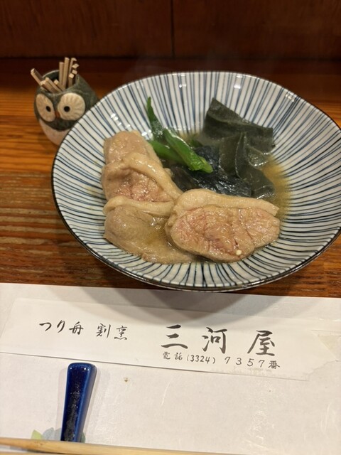 刺し盛りの旨さは言うまでもなく、白和えも2種類、初めてのあん肝バター焼きに衝撃を受けて、いつもの牡蠣のパン粉揚げの旨さにニヤニヤして、やっぱり三河屋の煮付けは凄いと再確認を魂に刻み、牛すじの煮込に初めましてと称賛を送りつつ、