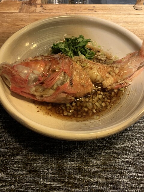 ハタかな、失念しました。まさか、こんなおもてなしを想像しておらず小躍りで興奮して記憶が。丸のまま蒸し器で酒蒸し。お皿に盛って醤油と熱々油がジュッとのやつです。シッカリあっさり身に味が入って香味ソースが更に。タレに浸してバウンドて飯うまです。