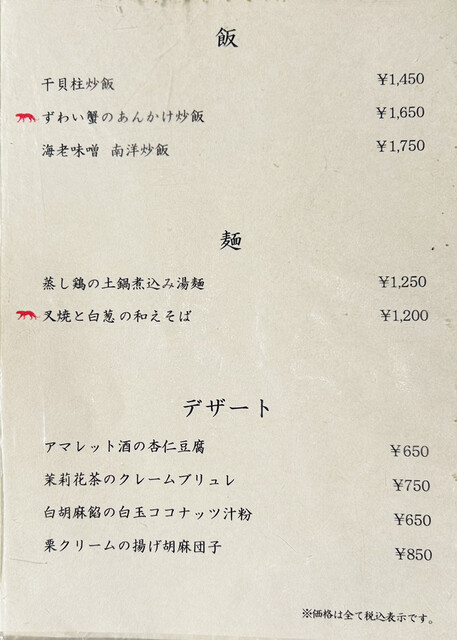 店先のメニュー(前菜・点心・スープ・飯・麺・デザート)