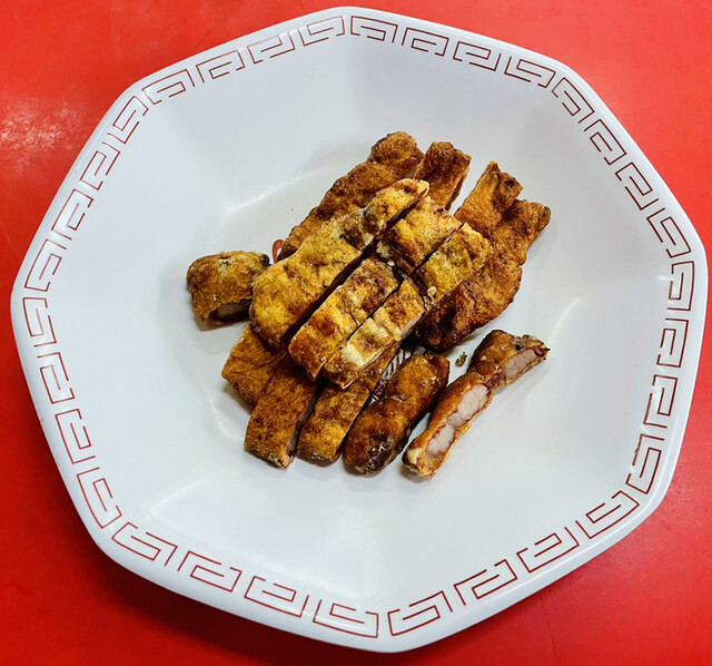•「豚肉をどついて叩いて腸に詰めて冷やす」“腸詰”に対して、「どつかず詰めずに揚げた(“腸詰”も揚げているから殆ど同じ)」ものと“紅糟肉(客家式チャーシュー)”を勧めてくれる。