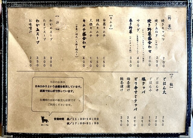 メニュー(野菜/キムチ/汁/ご飯)