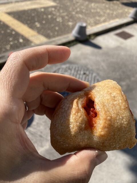 ソーセージ入りのパンがうまい。かみごたえがあり、噛めば噛むほどパンやソーセージ、トマトソースの味がしてとても好み!子どももパクパク!