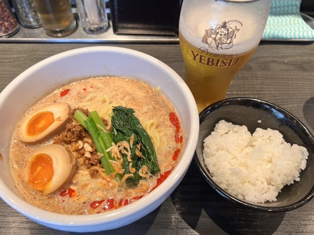 サービスエビス生ビール480円⇨290円 烈火黒胡麻担担麺 ちぢれ麺 980円 ねぎ100円 LINEクーポンで香味たまご ランチタイムライス無料