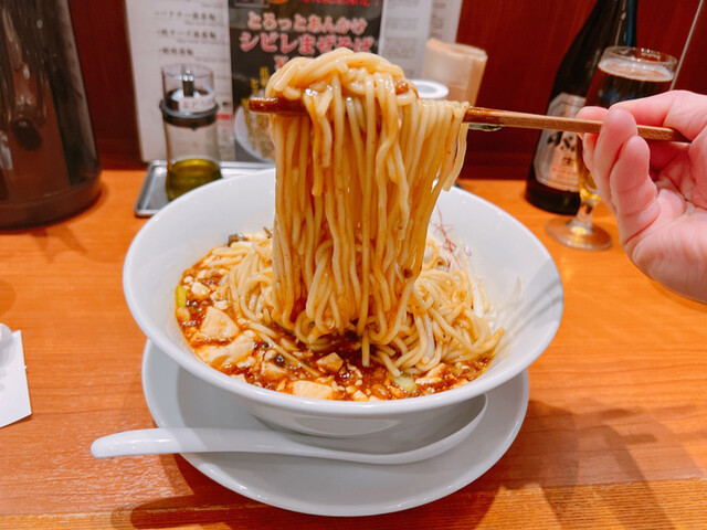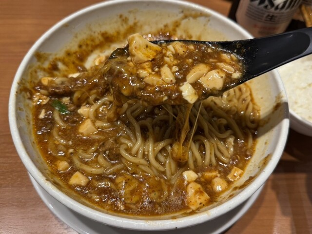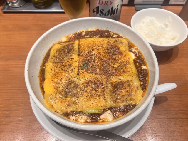 • 瓶ビール アサヒスーパードライ700円 焼きチーズ麻婆麺 倍辛1,600円 チーズトッピング200円 痺れ激増し100円 ランチサービス 半ライス