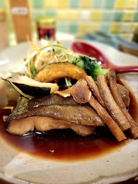 この食堂はヤバイです。手抜きが一切なくてひとつひとつが本物です。全てがハイクオリティで圧倒されました。主役の煮付けは分厚い切り身が2切れ。銀ダラの純白の身に煮汁が侵食し飴色に輝いています。そして付け合わせです。定番の揚げごぼう、豆腐、そして彩りの小松菜とニンジン。まずはその姿は完璧です。そして恐ろしく美味いです。銀ダラが蓄えた上質の脂、甘辛く深い旨味の煮汁。ヤバイです。衝撃的な逸品です。ごはんにのっけていただくと言葉になりません。震えるレベルです。