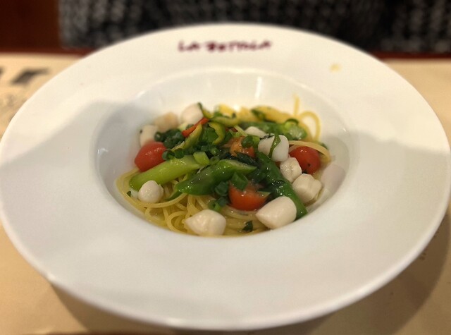 小柱とアスパラガス、フレッシュトマト入りアーリオオーリオ スパゲッティ