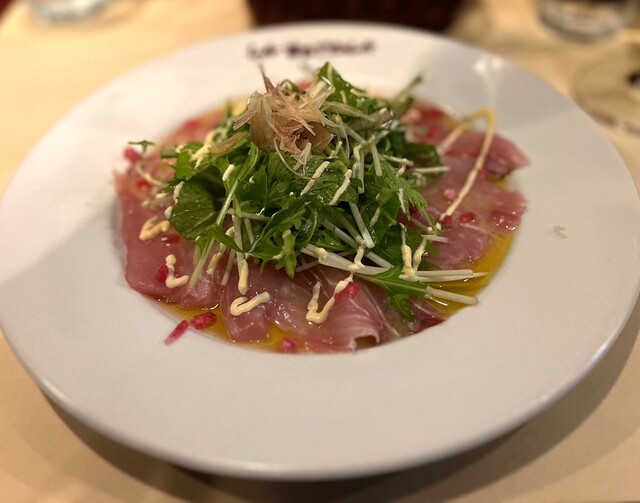 かるく燻製したカツオのカルパッチョ 新玉ねぎのドレッシングサラダ添え