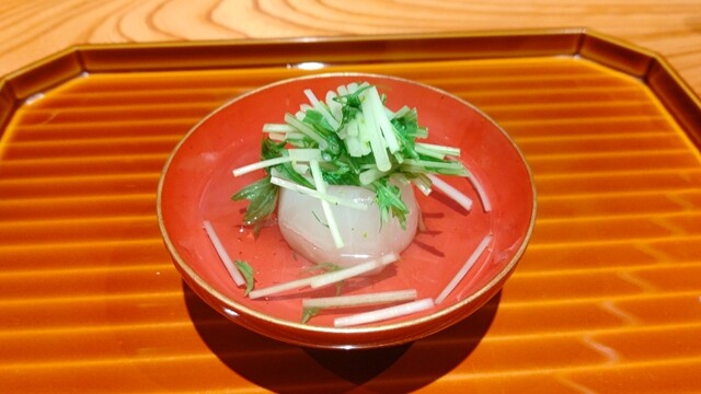 かぶをとろとろに煮たものに水菜をのせて鰹のお出汁で