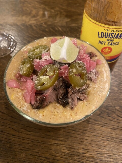 前菜にクリームコーンを。ピリ辛で肉もしっかり入ったテキサスおつまみ、最高です。あとはトリニティコンボを注文、ビールで流し込む。ソーセージはしっとり濃厚、ブリスケットはほろほろジューシー、ポークリブは大人のおしゃぶり。満足の一皿。ポテサラやコールスローももちろんのこと大変美味しく、リピ確なお店です。