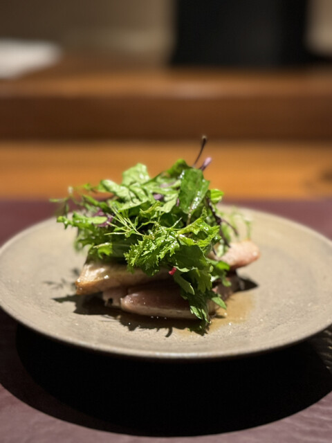 ・馬肉のソブラサーダ、エゴマの葉、大葉