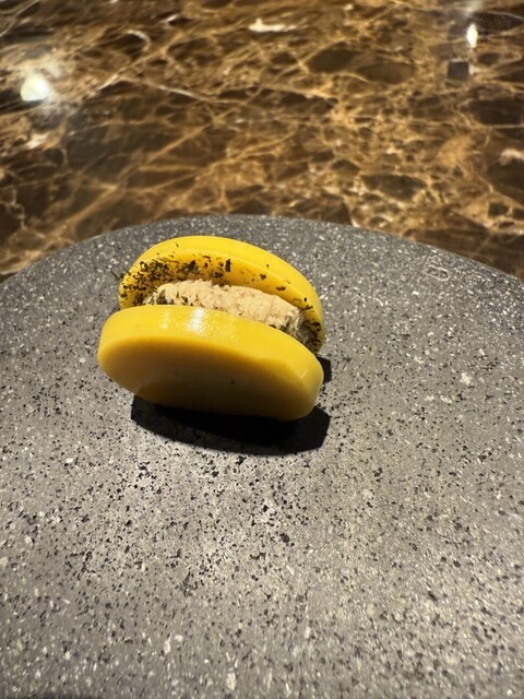 熱々の鯛のフリットのサクッとした食感、生ハムが鯛の熱で溶けて塩味が鯛とマッチします。ノリのパリッとした食感も