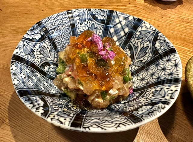 ジュレのかかった美しいなめろう。これ旨い!ちびちびといつまでも食べていられる。