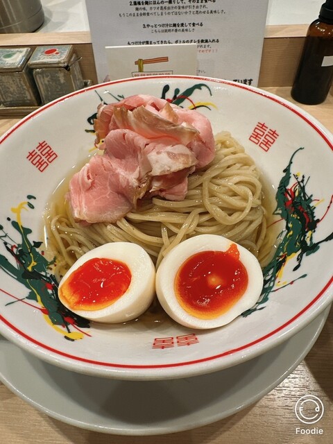つけ汁はクリアなのにしっかりした味で、中に海老ワンタンと肉ワンタンが入っている。両方ともプリップリで噛みごたえ抜群。麺をつけて食べる。感動的な美味しさ。麺に絡む昆布水でつけ汁後薄まったら味を復活させるアイテムもあり、最後まで美味しいまま食べることができる。秀逸!!
