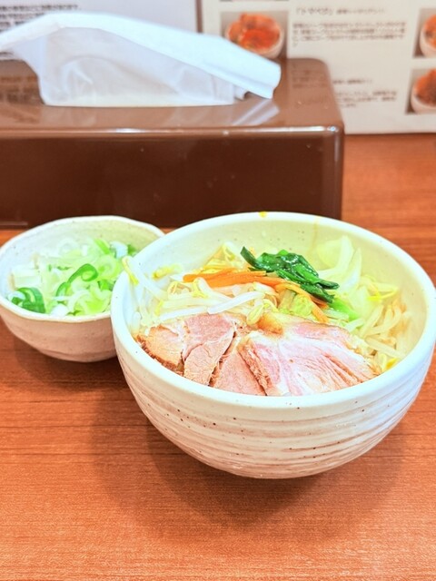 そのラーメンを啜りながら、キャベツ、もやし、にら、にんじんで180gの野菜が摂取できる野菜盛りを合わせながら食べると、濃厚系タンメンのような味わいになります