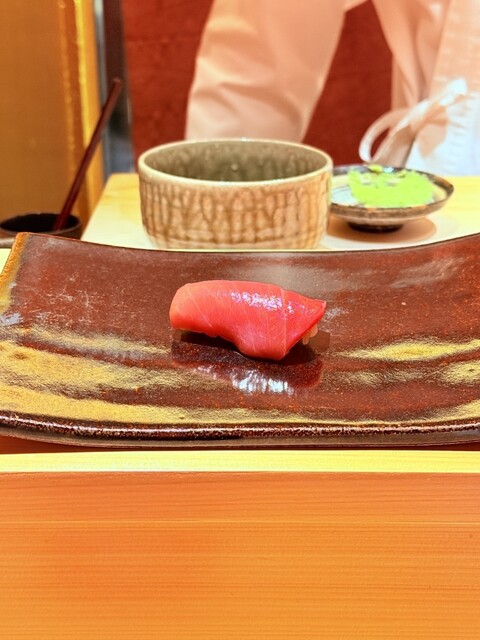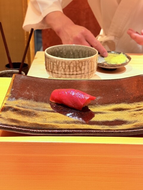 漬けは最後に仕上げのタレ漬けをしてさっと拭き取られ、マグロの味わいと柔らかさ際立つ一品