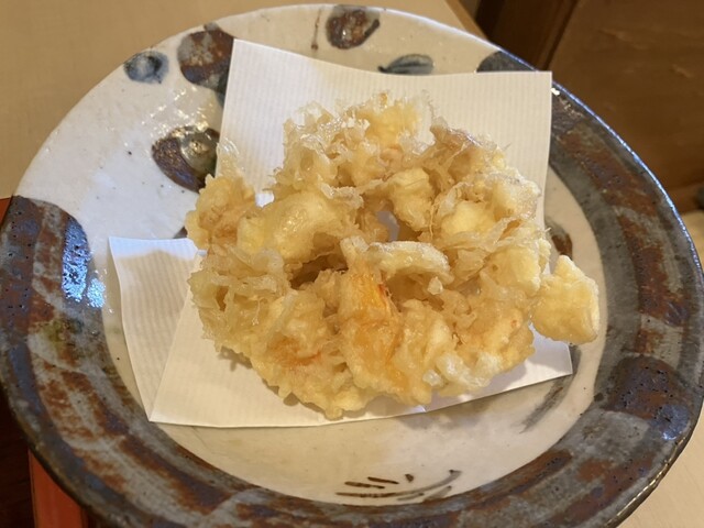 百合根と海老のかき揚げには、粗塩と天つゆが付いてきます。ホクホクした百合根と海老のプリっと感。美味しくて、お代わりしたくなります。
