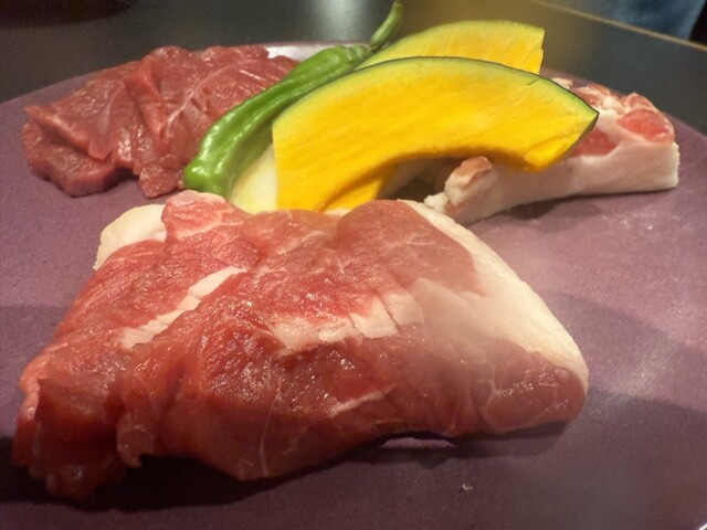 ジンギスカン3種盛り、野菜たち もも、ウデ、バラ