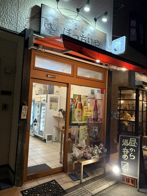 神楽坂駅徒歩5分にある神楽坂 ぼっちりやにて土佐の地酒とつまみ 冷蔵庫左側の立ち飲み用日本酒と、突き当りのショーケースからつまみを選択 閉店間際油の火を消すとのことで四万十川の青のりコロッケを追加