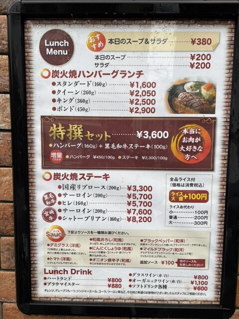 平日11時35分訪問 カウンター席に ランチメニューより炭火焼ハンバーグランチのスタンダード(160g)とおすすめの本日のスープ&サラダを注文 ソースは7種類ありハンバーグの定番デミグラスを選択