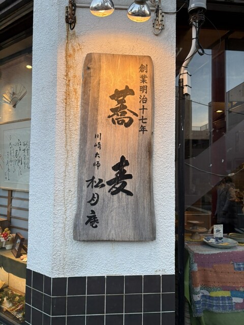 明治17年創業 川崎大師仲見世通り角にある松月庵 平日16時30分訪問 ウェイティングボードに名前を記入し約20分後に入店 人気の鴨つくねネギ棒から始め、〆は名代天ぷらそばと樽酒