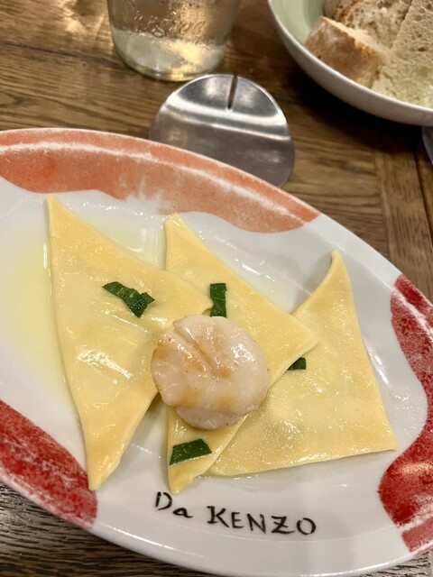 ズッキーニロマネスコを入れ込んだラヴィオリのソースは濃厚なバターとセージで作られるブッロ・エ・サルヴィアソース。上に大ぶりのホタテのグリルが乗っていて、これがまた、ラビオリと合う!
