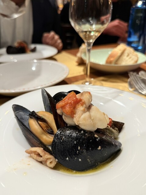 →ムール貝とあんこう(確か?)をトマトで煮込んだお料理。魚介から出るスープとトマトの甘みと酸味が合わさって、非常にコクがあって美味しい。パンにつけてスープも残さずいただきました。これが白ワインとよく合う!