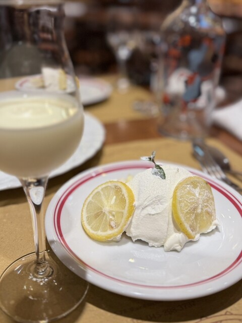 アマルフィ名物のレモンを使った爽やかなデザート。レモン風味のカスタードクリームとリモンチェッロを含ませたスポンジケーキがふわふわ。矢野ソムリエ特製の自家製リモンチェッロとのマリアージュも最高でした。