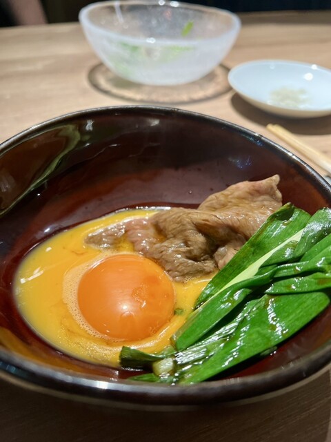 →栃木県のブランド卵「磨宝卵」に、山形産和牛のサーロインと九条ネギのしゃぶしゃぶを付けていただきます。卵は非常に味が濃くて美味しい!そこに口の中で溶けてしまう霜降り牛。そして、シャキシャキ感を少し残した九条ネギという素晴らしい食材のマリアージュ。最高に美味しくて至極のひととき。余った卵をTKGに出来るというのもまた嬉しい!