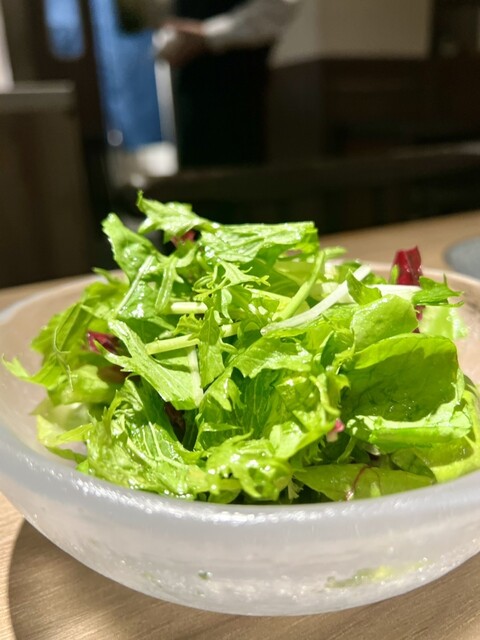 →このタイミングで様々なリーフ野菜を使ったサラダが口直し的に登場。味付けはごま油で味付けされていますが、強すぎず、香りを楽しめる程度になっていて、食欲を増進させます。