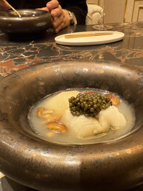 →ほとんど塩のみで味付けされ、素材の旨みや特性を最大限に生かしたお料理。脂の乗った金鱧をメインに、かぶのすりおろし、天然の大きななめこ、上には大粒のオシェトラキャビアを乗せて。キャビアから出る塩味が味のアクセント。またなめこのヌメヌメ感がかぶのすりおろしに独特の食感を与えていて、味だけでなく、食感も楽しめる。日本の食材の豊かさを改めて感じさせてくれる一品。