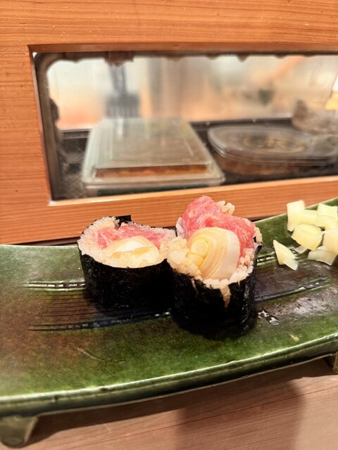 →先ほどのマグロとあえてざくっと切ったネギを入れて、海苔で巻いた「ころころ巻き」。これまたネギの美味しさとマグロの甘さ、シャリと海苔の香りがすべて合わさって、いくつでも食べられてしまいそうに美味しい。