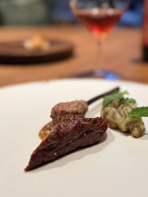 焼茄子を使った付け合わせのスモーキーな香りと滑らかな食感がお肉とバランスが取れていて素晴らしい。