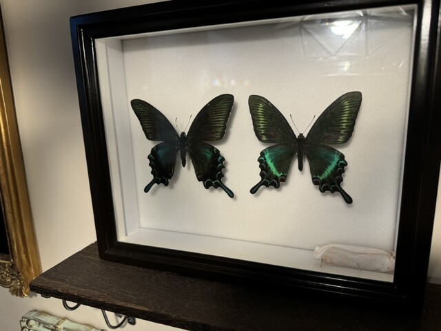 店内に入ると、赤いじゅうたんのようなフロアマット、蝶の標本や、蝶をかたどったランプなど、リーズナブルだけどこだわりと、センスの良さを感じる内装がお出迎え。2人席が5卓ほどの小さなお店です。