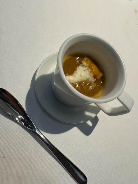 最初のアペリティフ、食前酒という意味と思いましたが、前菜前のアミューズ前のアミューズみたいなもののようでした。本当に一口で食べられるものでしたが、トマトのスープのようなものがおいしくて、写真を撮り忘れました。